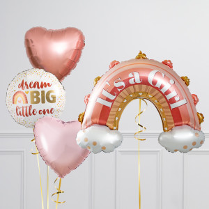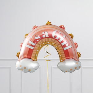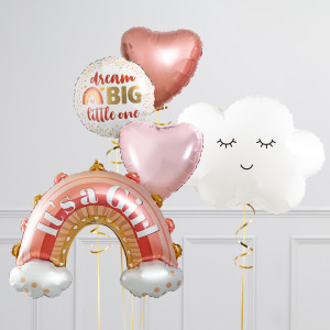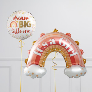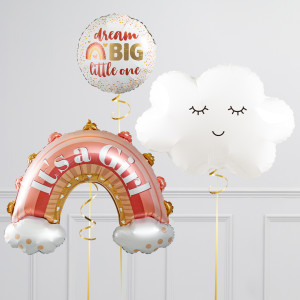 Upgrade your It's a Girl! rainbow balloon by adding a matching 18" Dream Big Little One round balloon, 18" hearts balloons, and supersize with a 30" cloud balloon.
