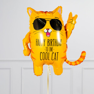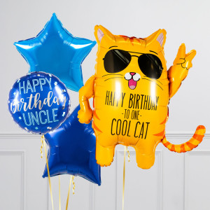 A helium Cool Uncle balloon-in-a-box arriving inflated via the post! The perfect Happy Birthday Uncle gift or birthday party decoration. You can order just the Cool Cat balloon supershape or go all the way up to the full package with 15 x sapphire blue mini balloons and 3 coordinating star foil balloons.