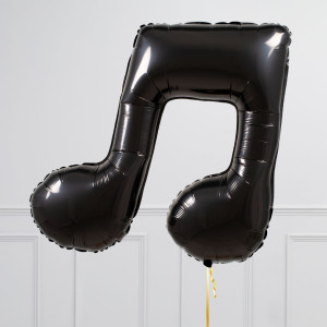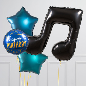A helium Music Note Birthday balloon-in-a-box arriving inflated via the post! The perfect music lovers' gift or birthday party decoration. You can order just the Music Note balloon supershape or go all the way up to the full package with 15 x sapphire blue mini balloons and 3 coordinating star foil balloons.