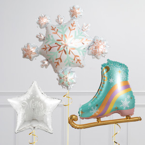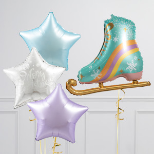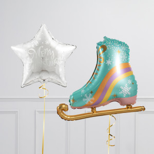 Upgrade your ice skate balloon by adding a matching 18" Merry Christmas silver star balloon, 20" star balloons, and supersize with a 32" snowflake balloon.