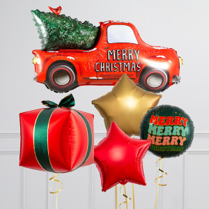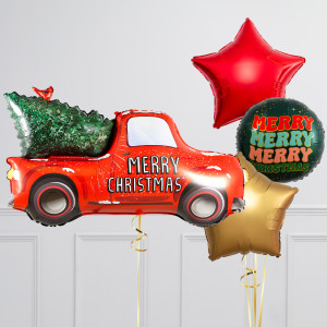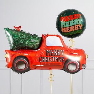Upgrade your Christmas Tree Pickup Truck balloon by adding a matching 18" Merry Merry Merry Christmas circle balloon, 20" star balloons, and supersize with a 25" 3D Christmas Present balloon.