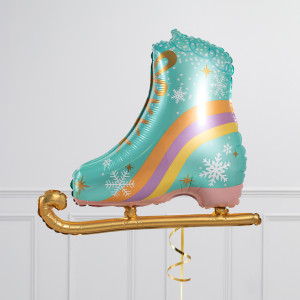 A helium-inflated 27" Ice Skate balloon on ribbon and a weight