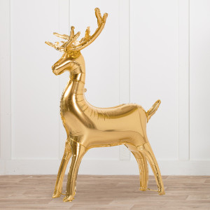 An air-inflated 43" Gold Reindeer floor standing balloon.