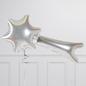 A helium-inflated 40" silver shooting star balloon on ribbon and a weight