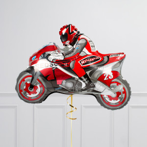 A helium-inflated 30" Red Moto Racing Motorbike Supershape balloon on ribbon and a weight