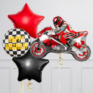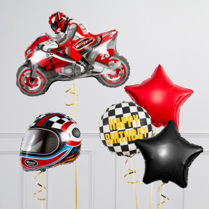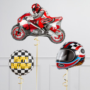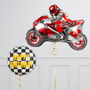 Upgrade your Motorbike balloon by adding a matching 18" Checkered Black & White Birthday Foil circle balloon, 20" star balloons, and you can add a 19" Racing helmet.