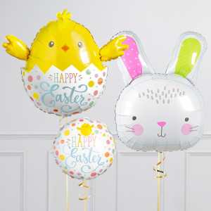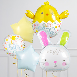 Upgrade your Happy Easter Chick balloon by adding a matching 18" Happy Easter round balloon, 20" star balloons, and supersize with a 28" Pastel Ears Bunny balloon.