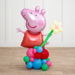 A personalised, air-inflated & freestanding, 26" Red foil number balloon on a Peppa Pig themed biodegradable latex balloon stack.