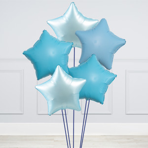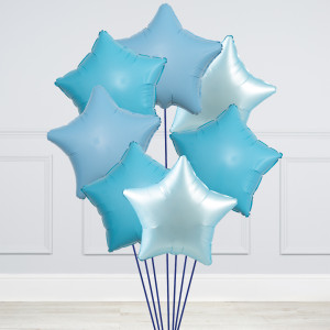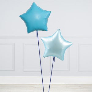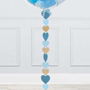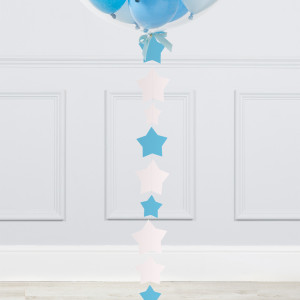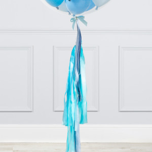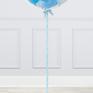 A helium-inflated 24" baby blue mini balloon filled bubble balloon on a tail and a weight in your design of choice.