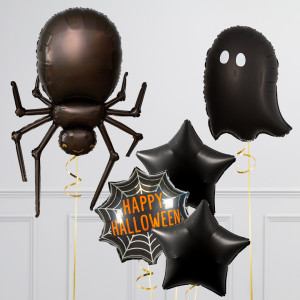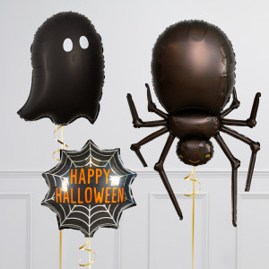 Upgrade your Spider balloon by adding a matching 18" Happy Halloween Spider Web balloon, 20" star balloons, and supersize with a 28" Iridescent Ghost balloon.