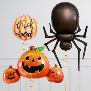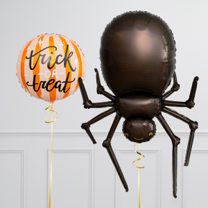 Upgrade your spider balloon by adding a matching 18" Trick or Treat pastel stripe circle balloon, 20" star balloons, and supersize with a 35" Pumpkin Trio balloon.