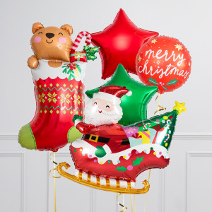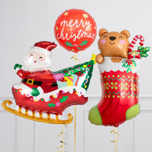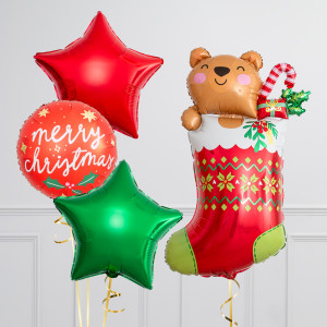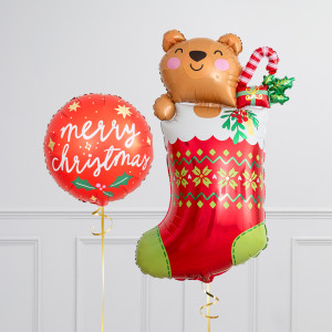 Upgrade your Bear Stocking balloon by adding a matching 18" Merry Christmas circle balloon, 20" star balloons, and supersize with a 30" Santa's Sleigh balloon.