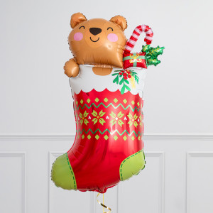 A helium-inflated 32" Bear Stocking balloon on ribbon and a weight