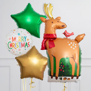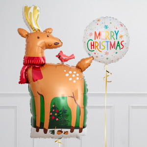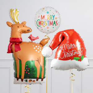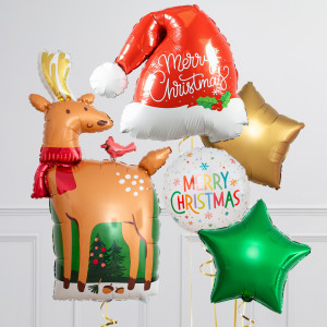 Upgrade your Reindeer balloon by adding a matching 18" Merry Christmas circle balloon, 20" star balloons, and supersize with a 25" Santa's Hat balloon.