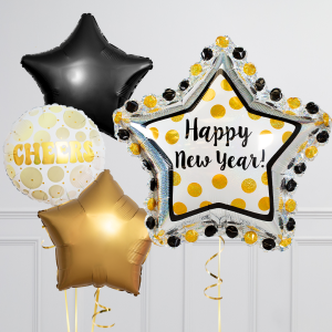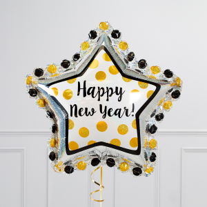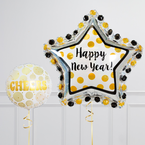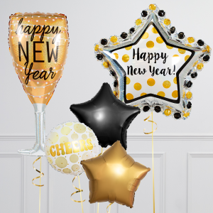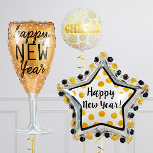 Upgrade your Happy New Year star balloon by adding a matching 18" cheers round balloon, 20" star balloons, and supersize with a 37" champange glass balloon.