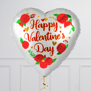 A helium-inflated 28" Happy Valentine's Day Heart balloon on ribbon and a weight