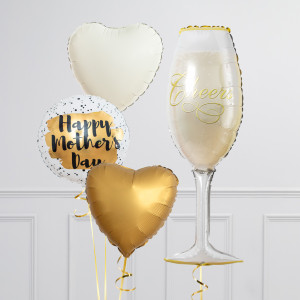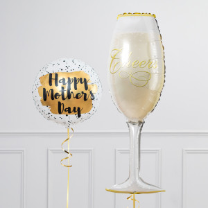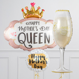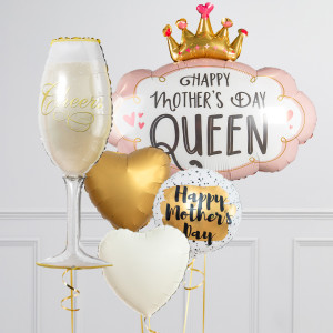 Upgrade your Cheers champagne balloon by adding a matching 18" Happy Mother's Day round balloon, 18" heart balloons, and supersize with a 37" Happy Mother's Queen balloon.