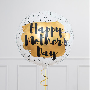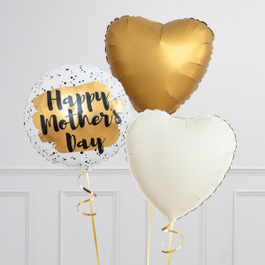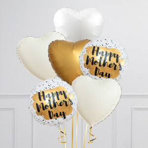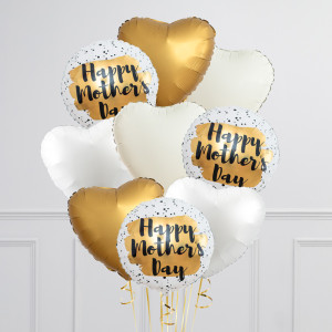 Upgrade your single 18" Happy Mother's Day round balloon by adding 18" heart balloons to make a bunch of 3, 6, 9 or 12 balloons in our gold, cream and white colourway.