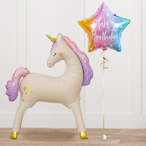 Upgrade your Unicorn balloon by adding a matching 18" Happy Birthday star balloon, 18" heart balloons, and supersize with a 34" holographic rainbow balloon.