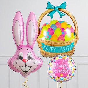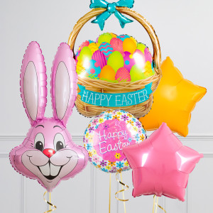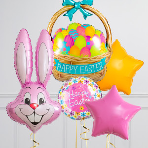 Upgrade your Bunny balloon by adding a matching 18" Happy Easter round balloon, 20" star balloons, and supersize with a 39" Easter Basket balloon.