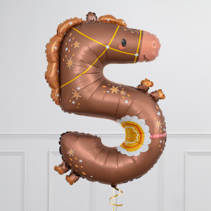 A helium-inflated 35" Number 5 Horse balloon on ribbon and a weight