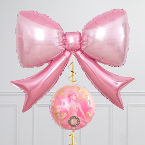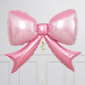 A helium-inflated 41" Pink Bow balloon on ribbon and a weight