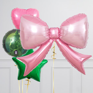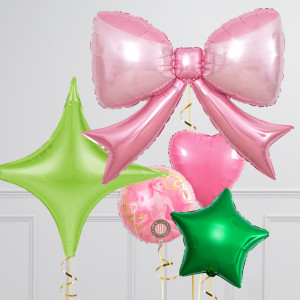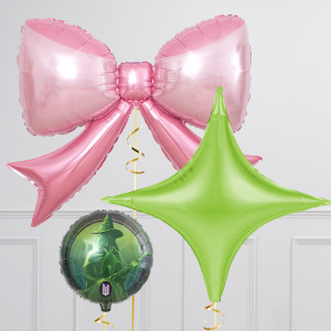 Upgrade your Bow balloon by adding a matching 18" Double Sided Glinda and Elphaba Circle balloon, 18" Heart balloon and 20" Star Balloon, and supersize with a 40" Green Star Point balloon.