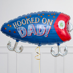 A helium-inflated 30" Hooked on Dad Lure balloon on ribbon and a weight